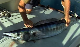 Now Jude, she's a vixen, put on her prettiest face, cuddled me, and massaged my sagging arms, and, well, I put the lure out a third time. Fortunately, nothing happened. Not straight away. Not till about four when the sun was heading for Africa did we hear the plastic spool clunk against the tower. I let out a moan, feeling decidedly weak. I would have settled for a steaming bowl of pasta, but being a good sailor boy and a slave to my woman, I took up my station back aft and tested the line. You know, you can feel the brute shake its head when trying to throw the hook, and feeling that sent adrenalin through me. A fight hey! You want to take me on? Okay, try it. So I pulled. And it fought. And I pulled some more using my shoulders and the strength in my back, which was about all I had left. Fifteen minutes later, the bell ending round ten sounded and a 20kg wahoo was heaved alongside where Jude ripped into it with the gaff. The two of us then struggled to bring a wiggling twitching monster up over the railing. All of a sudden, we had more fish then we could eat in a week. And that called for a cold beer before the bigger job of carving it up.